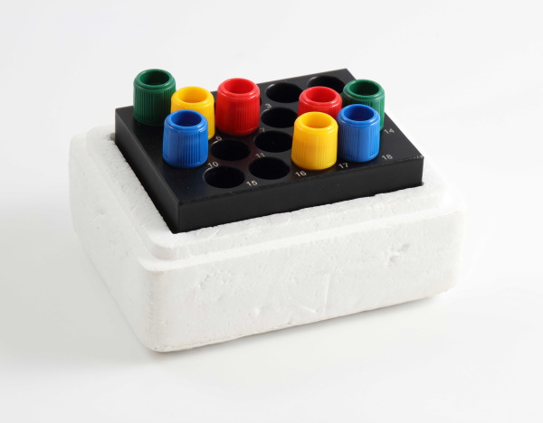 An 18-hole alluminium block encased in insulating polystyrene. With the polystyrene cover tubes remain below -20°C on the workbench for up to 45 minutes. This greatly enhances the stability of cultures and extends working time when they are removed from the freezer.