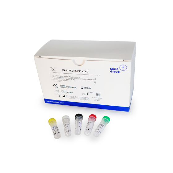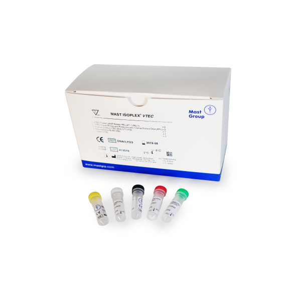 MAST ISOPLEX® VTEC kit is optimised for typing of VTEC variants 1 and 2 (VT1 and VT2). VT1 and VT2 genes can be discriminated simultaneously in a triplex assay format with an inhibition control DNA (IC DNA)